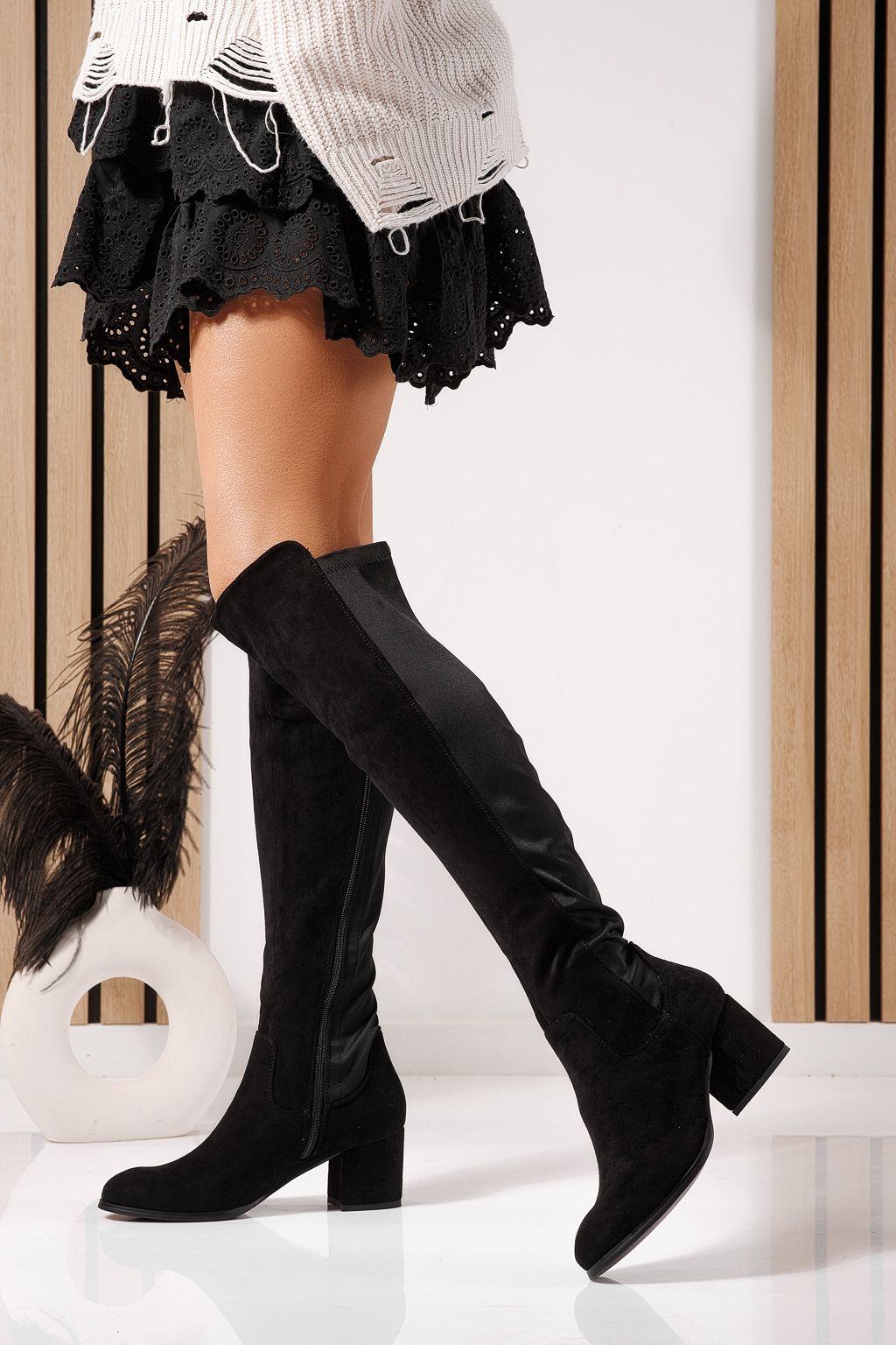 Cizme lungi dama captusite negre din piele ecologica intoarsa Rain #23102